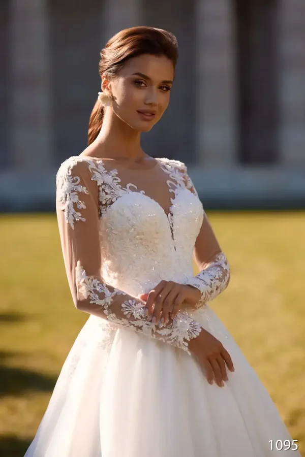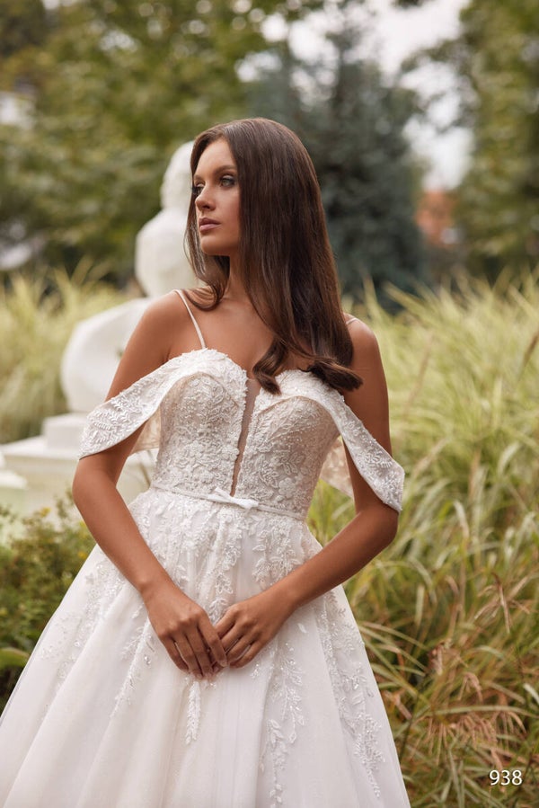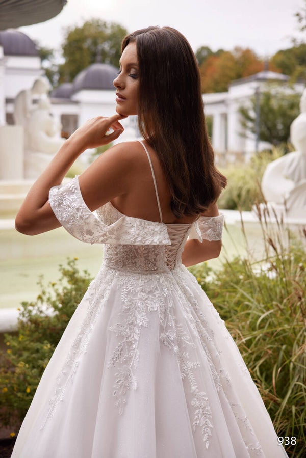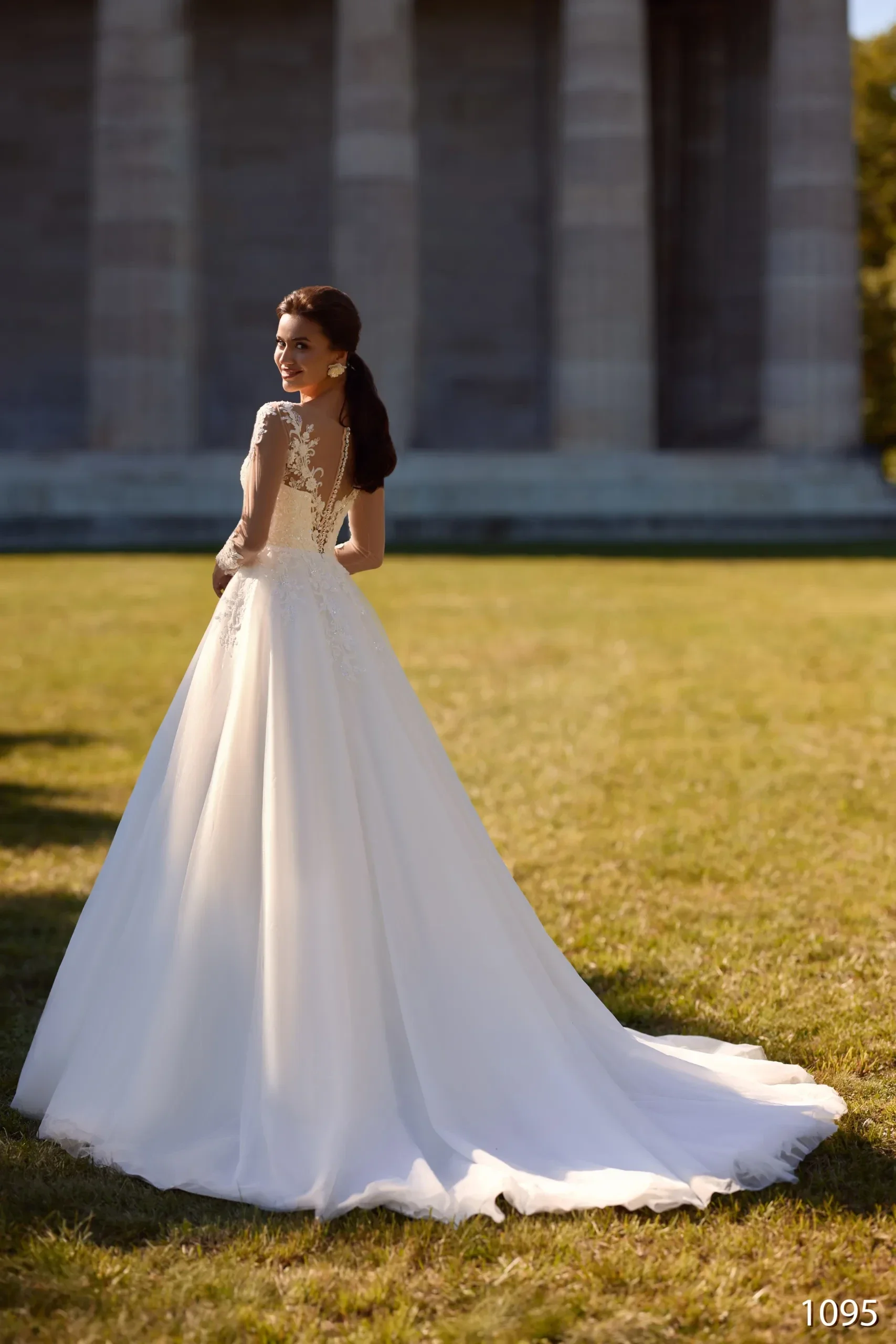 Cette magnifique robe de mariée a un effet architectural. L'imposante broderie du haut, crée un effet visuel spectaculaire et garantit une apparence inoubliable.