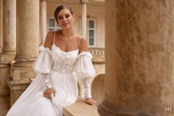 Superbe robe en dentelle florale avec manches bouffantes, parfaite pour toutes les mariées souhaitant un look bohème !
