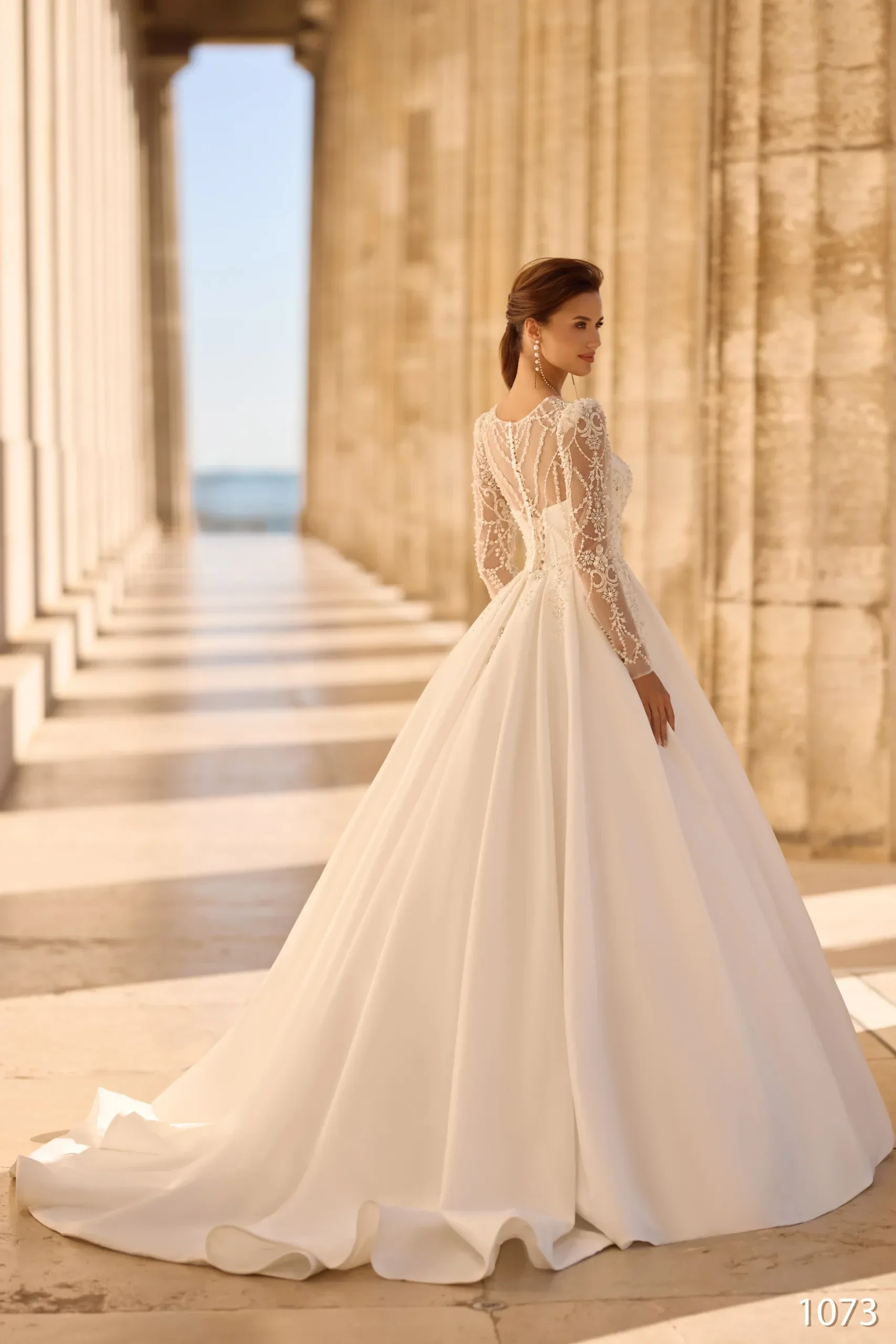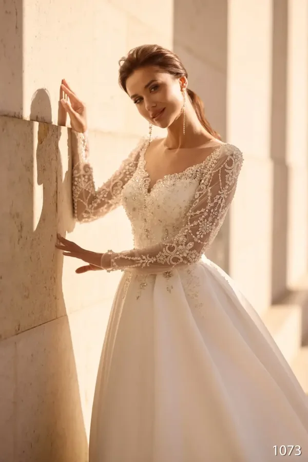 Cette somptueuse robe aux détails fins et aux broderies précieuses accentue la taille et la ligne du buste.