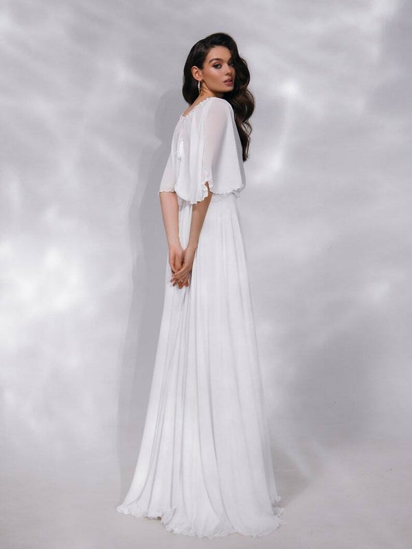 Cette robe de mariée incarne tout ce qui est vintage et avec son haut en forme de cape, elle passe facilement d'une cérémonie de mariage ensoleillée à une réception fraîche en soirée. Cette robe est plus simpliste dans sa conception que la plupart des robes, mais elle fera ressortir le glamour de chaque mariée.